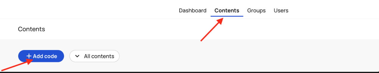 To activate the content, click on the Contents tab, then on the blue + Add code button and enter the code.