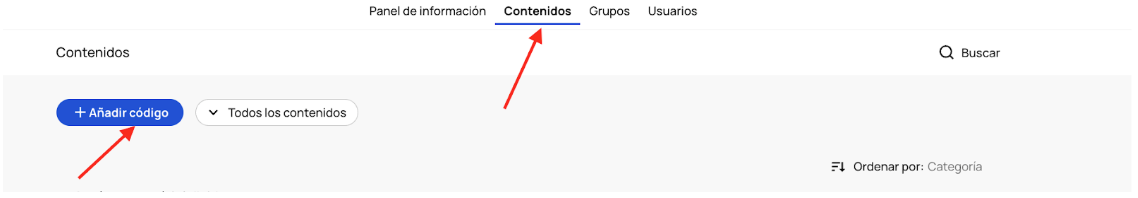 Si ya tienes productos en tu pantalla de inicio y deseas añadir más códigos, haz clic en la pestaña Contenidos, luego en el botón azul + Añadir código .