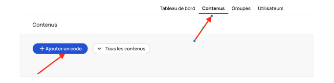 Pour activer d'autres contenus, vous devez cliquer sur l'onglet Contenus puis sur le bouton bleu + Ajouter un code et saisir le code.